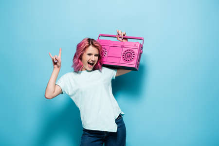 excited young woman with pink hair holding vintage tape recorder and showing rock sign on blue background