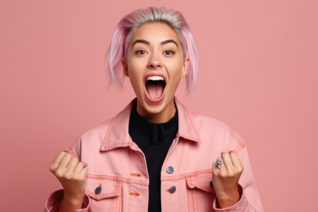 Ecstatic woman pumps her fist in the air in celebration Creating using generative AI tools