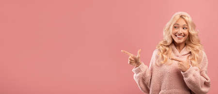 Excited young lady pointing and looking aside at empty space, demonstrating place for your ad text or design, panorama