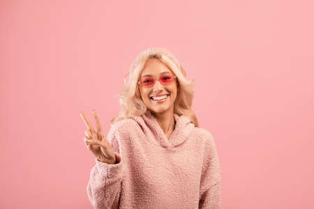 Good mood. Happy stylish lady showing victory v sign and smiling at camera, wearing colorful sunglasses