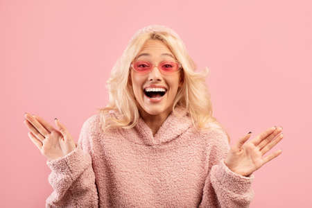 Positive emotions. Excited stylish lady screaming with joy and spreading hands, posing over pink studio background