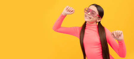 dancing child in glasses. fashion accessory. going crazy. positive emotions. childhood happiness. Child face, horizontal poster, teenager girl isolated portrait, banner with copy space.