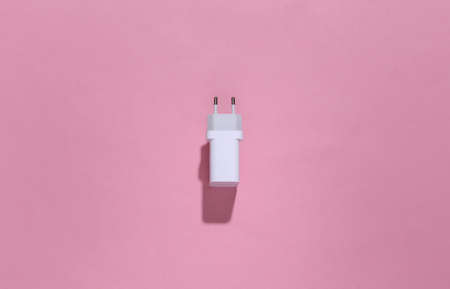 Charger adapter on pink bright background with deep shadow. top view. flat lay. minimalism