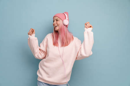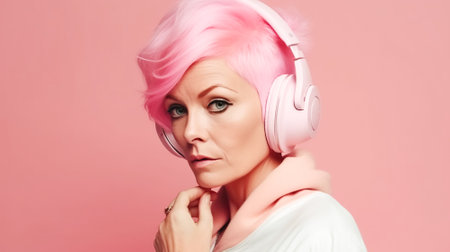 Modern young woman short haircut with pink hair and headphones, Barbicor style. Portrait of a smiling happy attractive woman