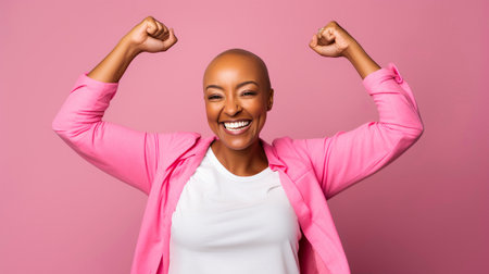 woman fighting breast cancer, clenches her arms as a survivor fighter