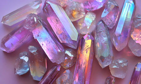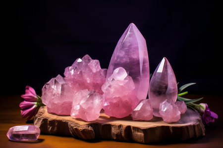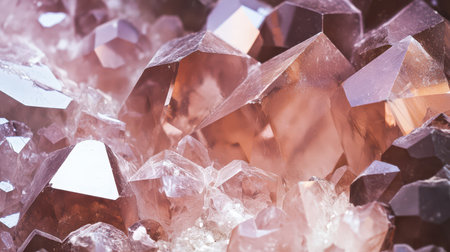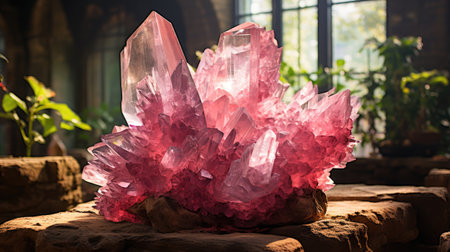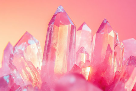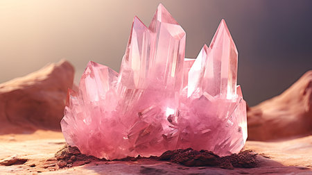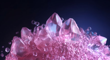 AI Generated. Pink quartz crystals with shimmering facets illuminated by soft light in a colorful mineral display