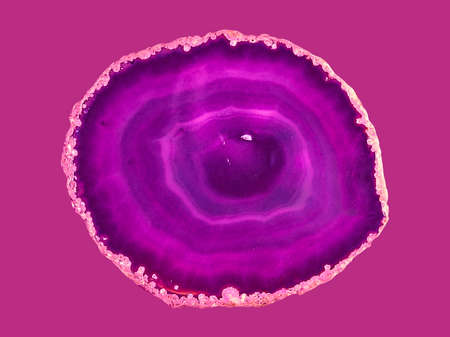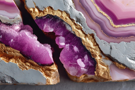 Close-up of semiprecious geode showcasing bright purple amethyst crystal interior surrounded by gray matrix and golden edges.