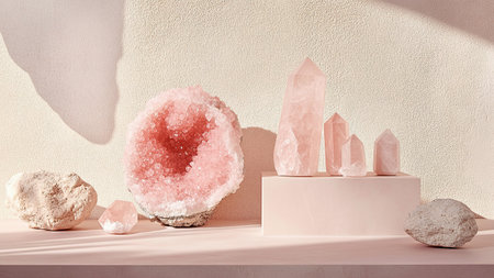 Enchanting Quartz stones pink background. Decoration spa. Generate Ai