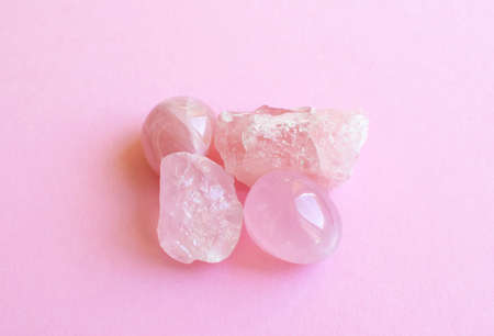 Crystals of rose quartz on a pink background. Beautiful semi-precious stones