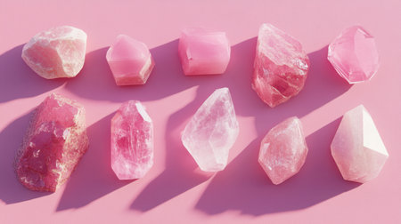 A cluster of rose quartz crystals, each with a unique, multifaceted shape, rests on a pale pink surface, reflecting the sunlight. The crystals gleam with a soft, rosy hue, highlighting their intricate textures and delicate details.
