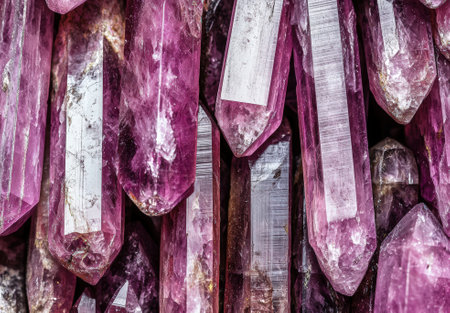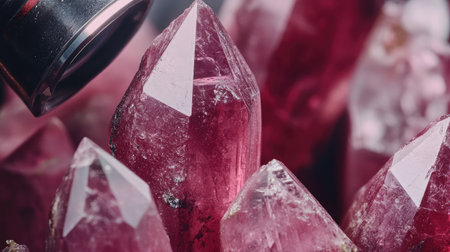 This captivating image features a close-up view of vibrant pink crystals displaying intricate details and reflections of light, perfect for artistic purposes.