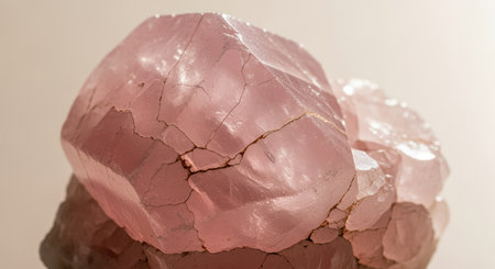 Raw rose quartz crystal with natural cracks and reflections on soft beige background for healing and wellness concepts.