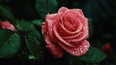 Beautiful pink rose with dew drops close-up macro photography