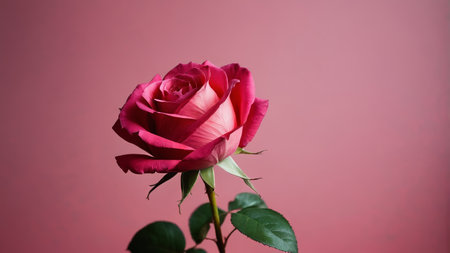 Close up of a single red rose on pink background