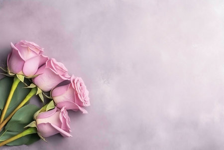 Close view of pink roses arranged beautifully with soft purple background. The delicate petals and gentle lighting create a calm, romantic atmosphere perfect for decoration.