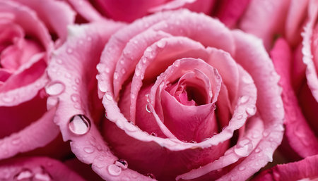 Extreme close-up of vibrant pink rose petals adorned with tiny water droplets, set against a soft green bokeh background.
