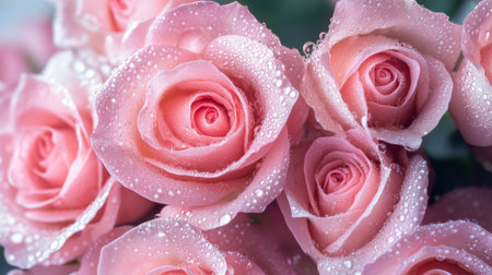 A close-up of a bouquet of pink roses with dew drops, highlighting their delicate petals and vibrant color against a clean, neutral background.