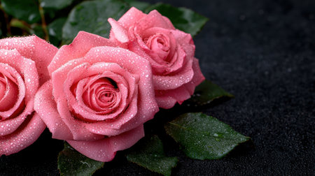 Three pink roses with water droplets on a dark background.