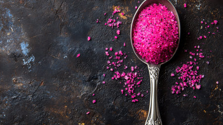 Vibrant pink salt shards and delicate beads artfully spread on a dark, textured backdrop, creating a striking contrast and artistic elegance.