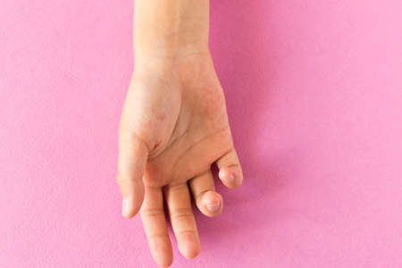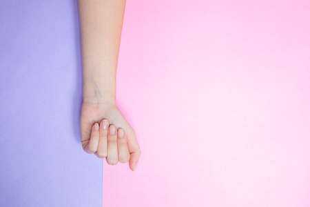 A girl's hand on a pink background. Close up. Selective focus