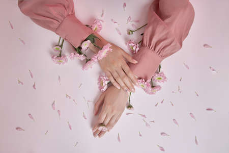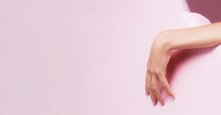 Elegant female hand with an empty palm down on a pink pastel background.