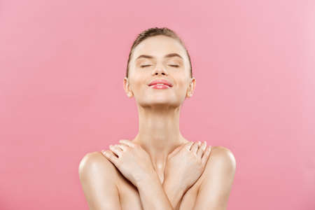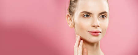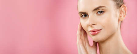 Beauty Concept - Beautiful Woman with Clean Fresh Skin close up on pink studio. Skin care face. Cosmetology.