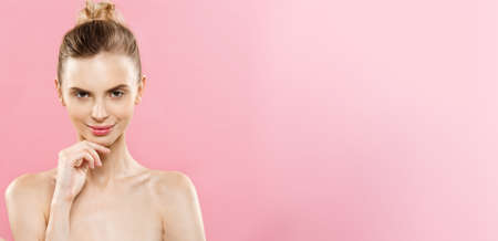 Beauty Concept - Beautiful Caucasian woman with clean skin, natural make-up isolated on bright pink background with copy space.
