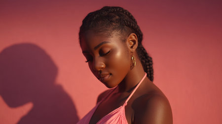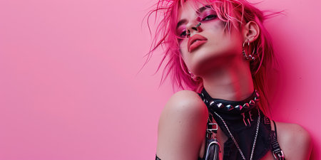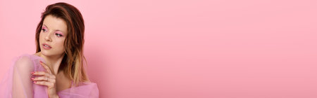A young woman in a chic studio showcases stunning pink makeup and a sheer blouse, banner