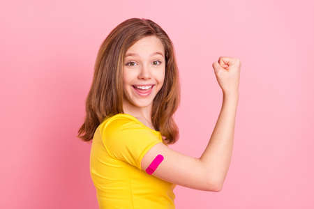 Profile side photo of young girl happy positive smile show arm muscles plaster healthcare isolated over pink color background