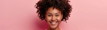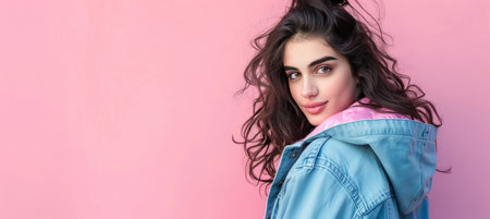 Beautiful young brunette woman with curly hair on a pink background in the studio.