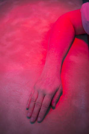 Hand, forearm and arm of injured patient receiving treamente under red physiotherapy rehabilitation hospital clinic heat lamp.