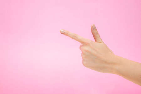 Woman's hand making shooting gun, gesture. hand pistol gesture on isolated pink background. Woman hand pointing with one fingers.