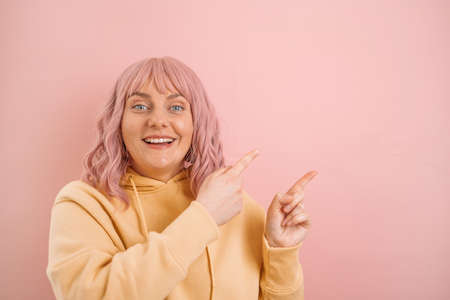 Attention promotions banner. Charming young caucasian woman with pink hair pointing finger to the side on a copy space isolated on pink background. Mock up copy space
