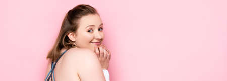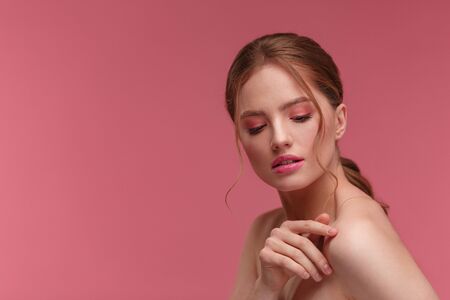 young woman with bare shoulders and makeup touching face isolated on pink