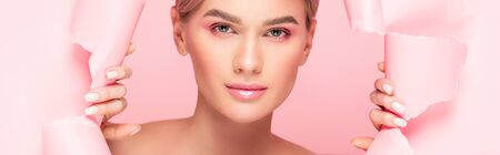 panoramic shot of tender woman with pink makeup in torn paper, isolated on pink