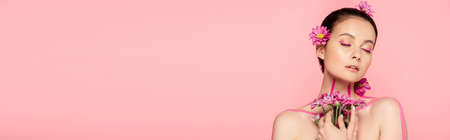 naked beautiful woman with closed eyes, pink lines on body and flowers in hair holding bouquet isolated on pink, panoramic shot