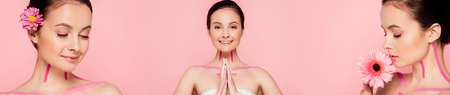 collage of happy naked beautiful woman with pink lines on body and flowers isolated on pink, panoramic shot