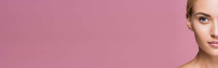 cropped view of beautiful blonde woman with perfect skin isolated on pink background