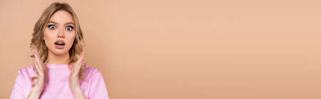 amazed woman looking at camera and showing wow gesture isolated on beige, banner