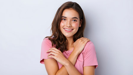 Portrait of a beautiful young woman or teenage girl posing over pink background.