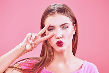 Cute girl teenager in a pink t-shirt posing on a pink background. Youth style. Cosmetics and make-up. The youth gestures.