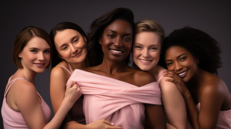 United for Hope: Multiethnic Women Hug, Spreading Breast Cancer Awareness.