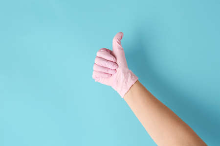 Hand in protective glove showing thumb-up on color background