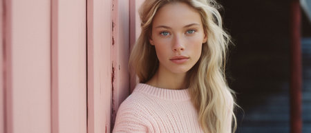 A young woman with short blonde hair poses confidently against a soft pink background, radiating natural beauty and modern elegance, ideal for fashion and beauty marketing.