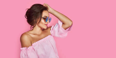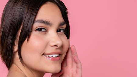 beauty, skin care and people concept - Beauty fashion model girl natural makeup with cute smile on pink background. 16: 9 panoramic format.