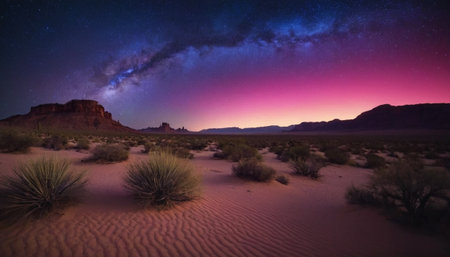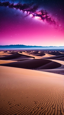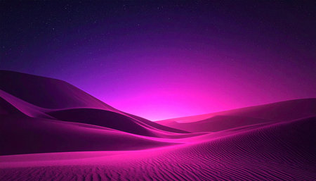 A stunning evening landscape featuring rolling sand dunes under a magenta gradient starry sky, perfect as a wallpaper for evoking tranquility and natural beauty.
