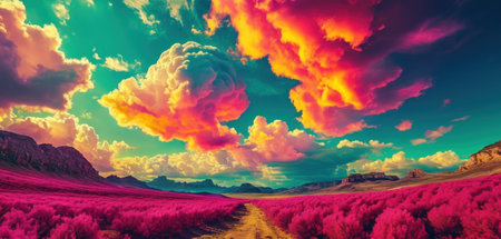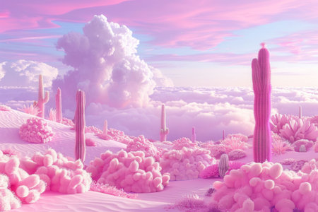 Surreal landscape with pink cacti and fluffy clouds under a vibrant sky