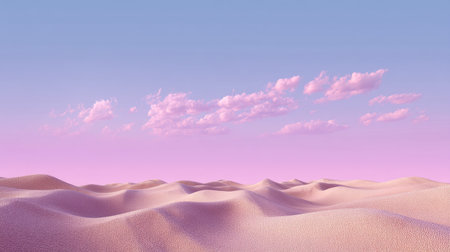 A surreal landscape of rolling pink sand dunes stretches towards a twilight sky. Wispy clouds drift across a gradient of purple and pink hues. The soft light casts gentle shadows, highlighting the rippled texture of the sand and the undulating forms of the dunes. The scene evokes a sense of peace and vastness.