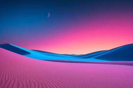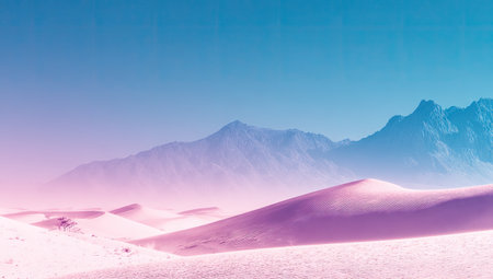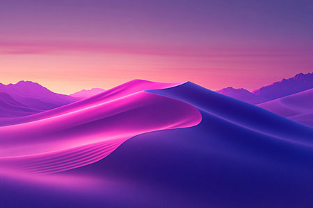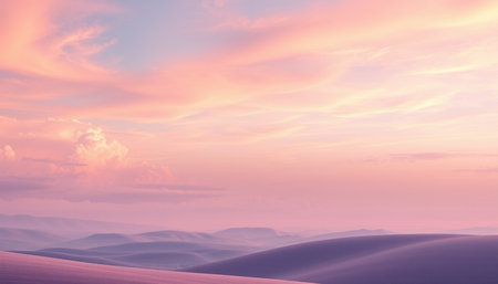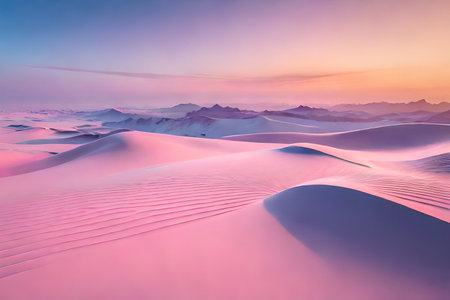 Serene desert landscape painted in vibrant, pastel shades of pink, blue, and purple. Rolling sand dunes stretch towards a distant mountain range, creating a peaceful and beautiful vista. The soft light and colors create a dreamy and almost ethereal atmosphere.
