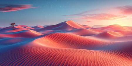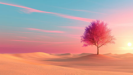 A stunning landscape featuring a solitary pink tree set against rolling sand dunes during a colorful sunset, creating a tranquil and serene atmosphere.